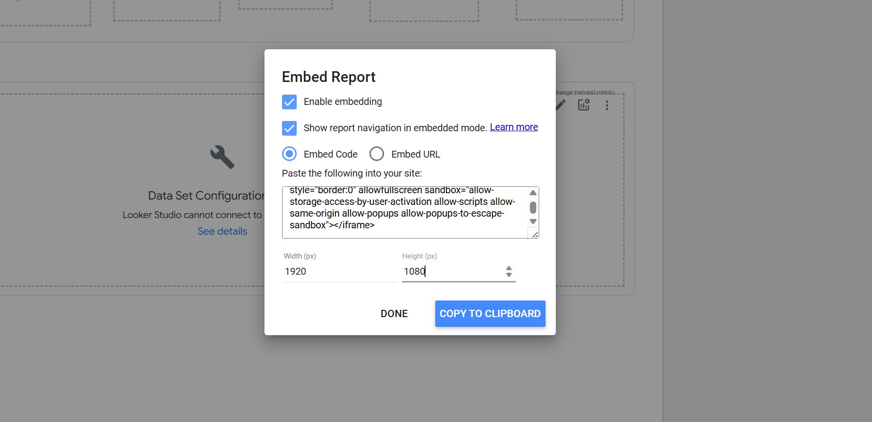 Enter a name for your assets & paste the Embed Code copied from Data Studio here.